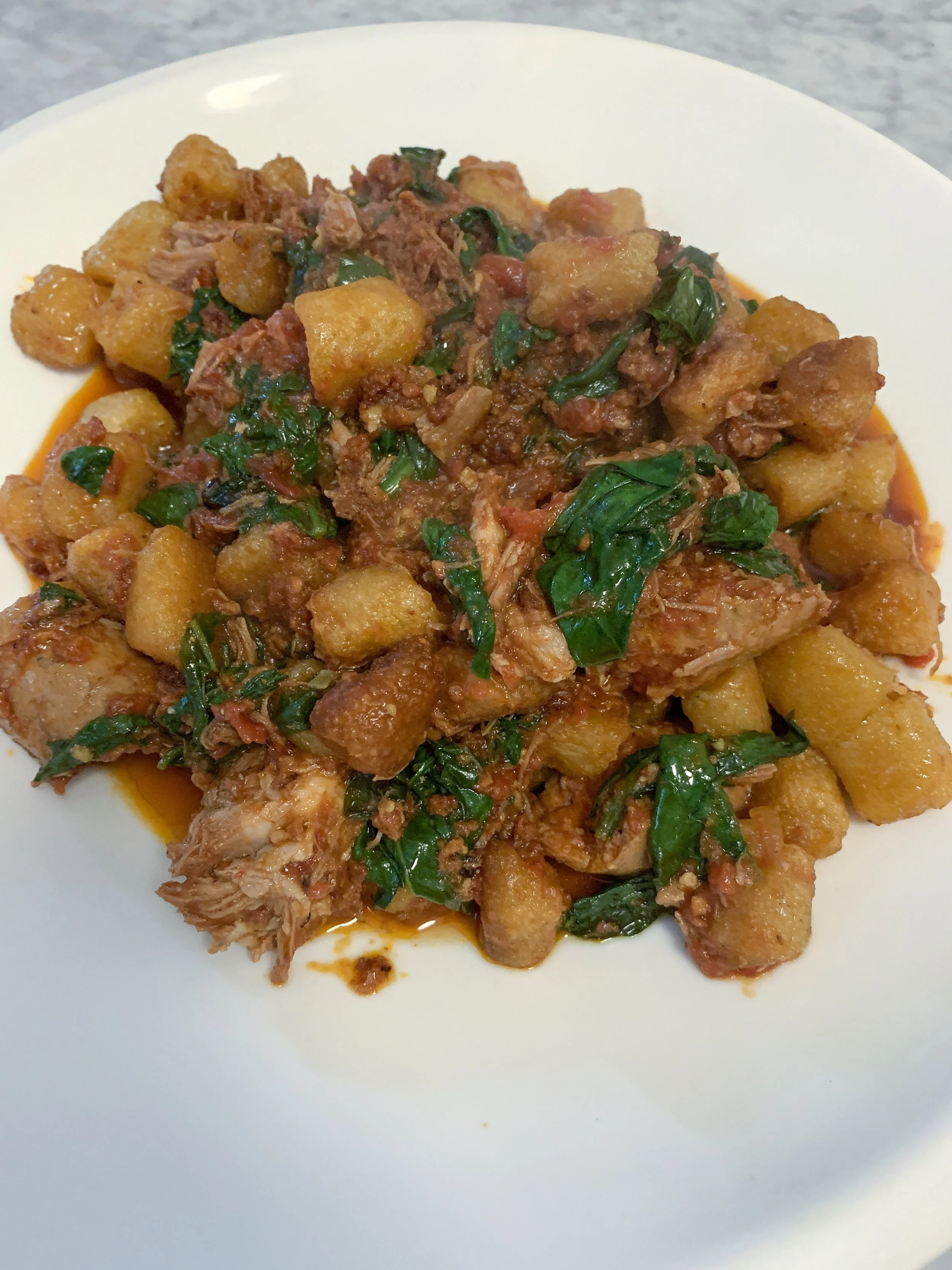 Add 2 cups baby spinach to the sauce and allow to wilt. Finally, place the baked gnocchi to combine, gently turning to coat with the sauce, and add nduja for one final turn of the pan.